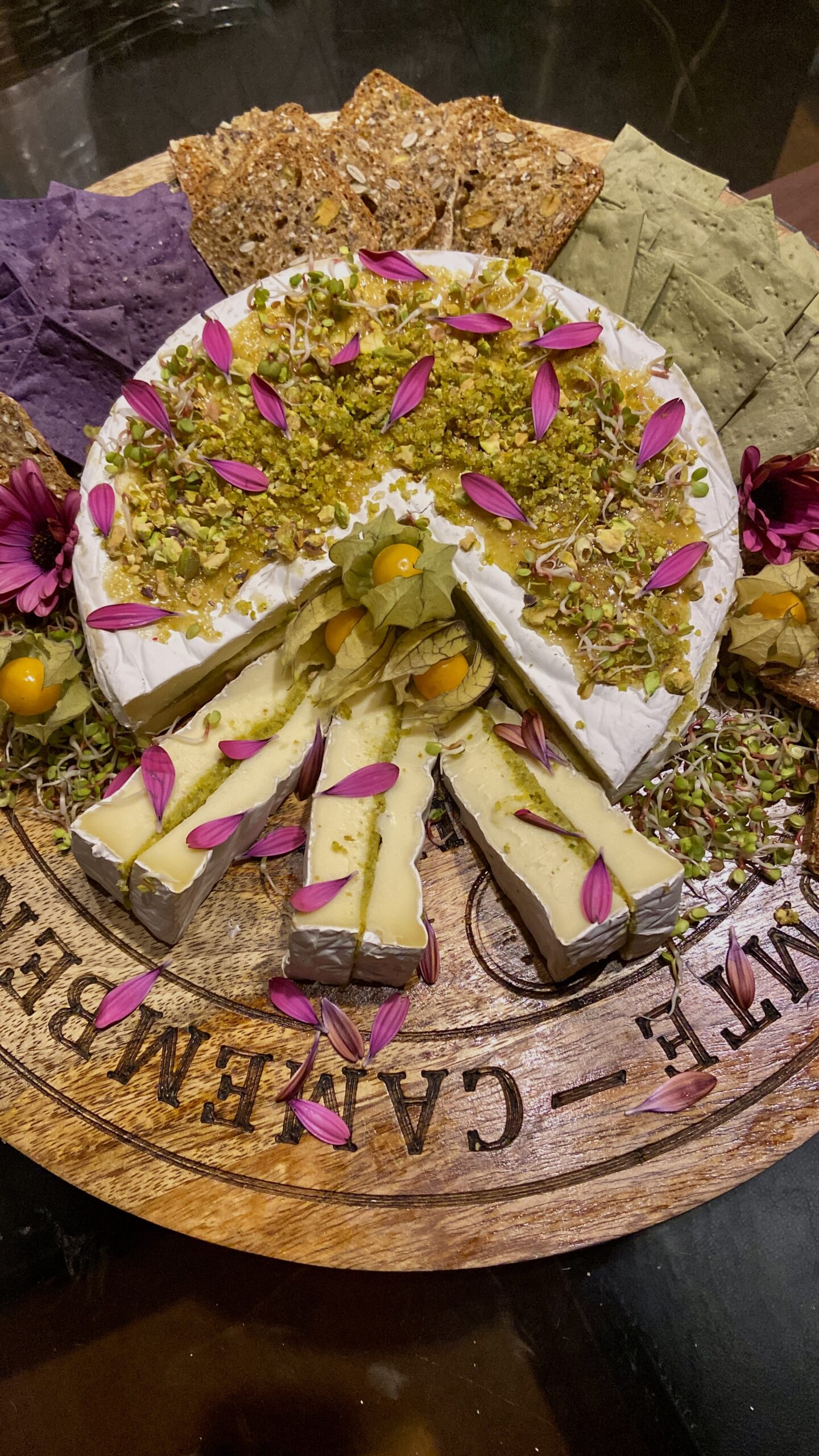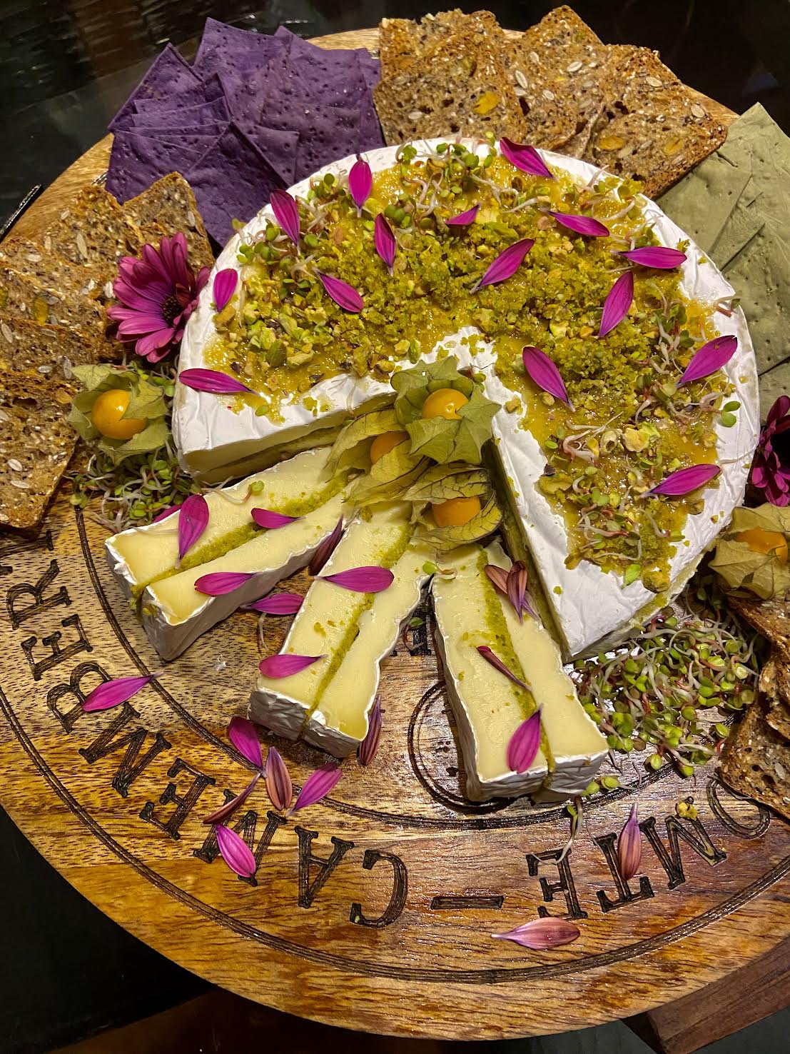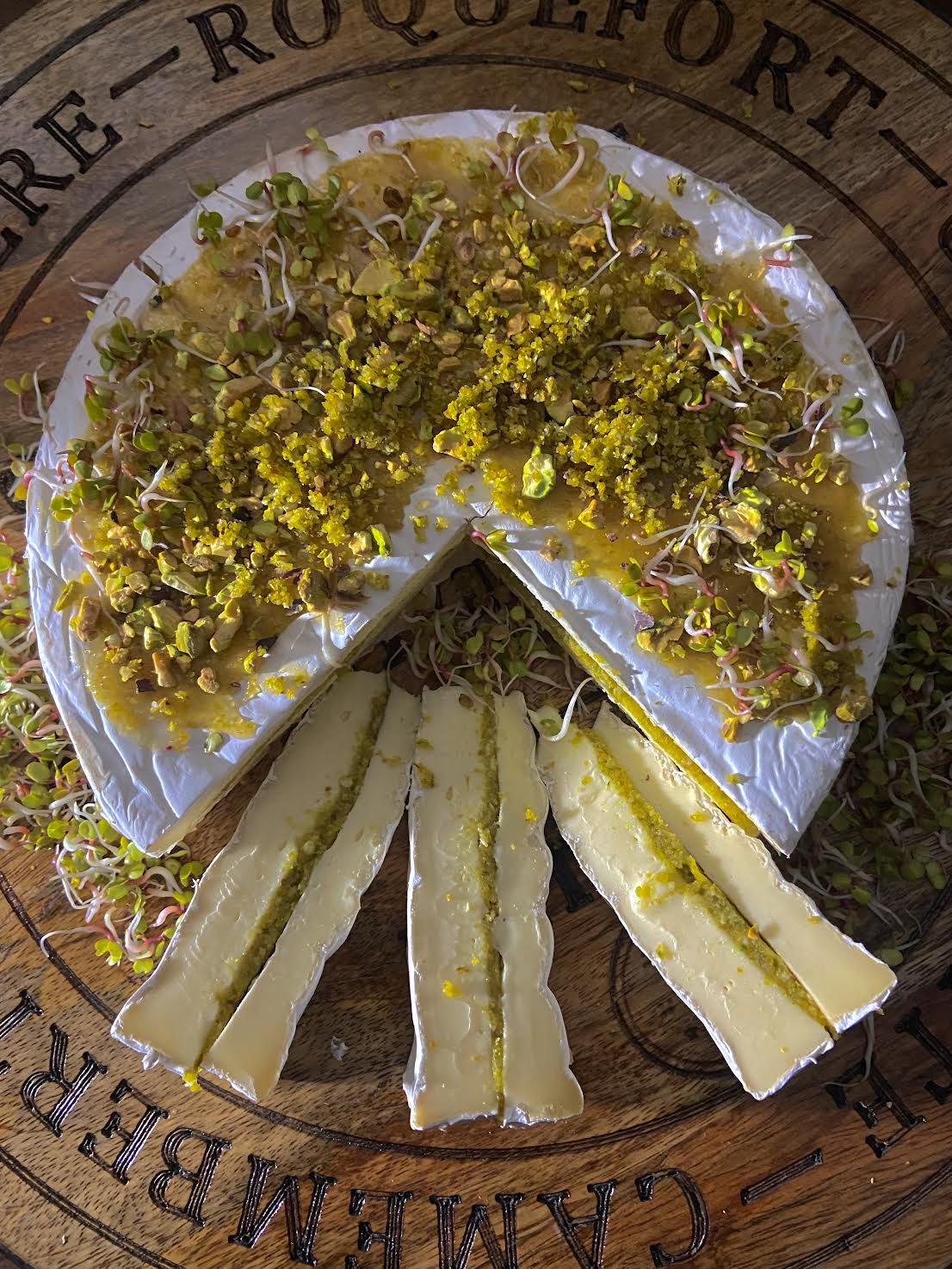 Y como si todo fuera poco, ahora puedes pedir un espectacular Brie Dubai, relleno con pasta de pistachos y en la superficie, decorado con caramelo, pétalos de flores comestibles y no puede faltar, trozos de pistachos que decoran nuestro queso…